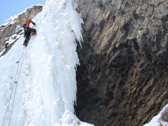 Day 1: Instruction in basic ice climbing skills: placing ice screws, setting up belays, safe abseiling techniques and basic avalanche awareness. The single pitch tuition is dealing with placing ice tools and positioning of feet.